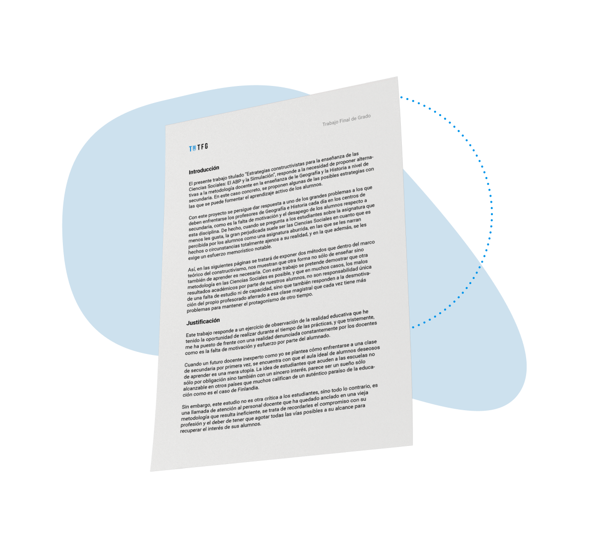 Aquí reunimos la información para hacer tu TFG y la complementamos con fuentes de información fiables. Después, siguiendo el los requisitos y la normativa de tu universidad, estructuramos todos los apartados del mismo.