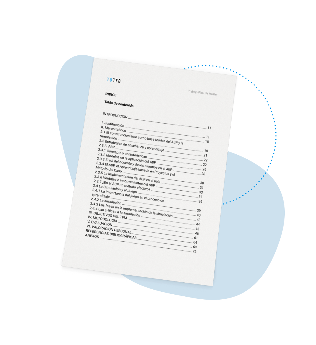 Diseñamos los apartados que el proyecto necesite, siguiendo los requisitos de tu universidad. Lo redactaremos por entregas, para que des tu aprobación.